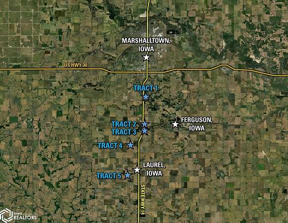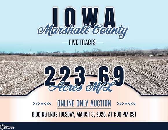 Marshall County, Iowa Online Only Farmland Auction! - BIDDING IS CURRENTLY LIVE and set to conclude on Tuesday, March 3rd, 2026, at 1:00 PM CST! We are pleased to present 223.69 acres m/l of productive farmland with building site potential in Southeast Marshall County, Iowa along the State Highway 14 corridor. The sale consists of five productive, tillable farmland tracts located south of Marshalltown, Iowa. Tract 1: 79.46 acres m/l with 75.60 FSA cropland acres m/l carrying an average CSR2 soil rating of 73.5 Tract 2: 13.45 acres m/l with 13.69 FSA cropland acres m/l carrying an average CSR2 soil rating of 85.2 Tract 3: 36.13 acres m/l with 33.70 FSA cropland acres m/l carrying an average CSR2 soil rating of 60.7 Tract 4: 40.00 acres m/l with 35.28 FSA cropland acres m/l carrying an average CSR2 soil rating of 51.1 Tract 5: 54.65 acres m/l with 54.20 FSA cropland acres m/l carrying an average CSR2 soil rating of 63.7 As a whole, the farm consists of 212.17 FSA cropland acres with prominent soil types of productive Killduff silty clay loam, Tama silty clay loam, Ackmore-Colo complex, Downs silt loam, and Shelby loam. These high-quality tracts would make great add-ons to an existing farming operation or a smart investment for the Buyer looking to diversify their portfolio. This is a rare opportunity to own productive tracts in a strong farming area. Visit our website for more information regarding this 5 tract ONLINE Auction.