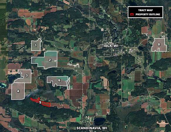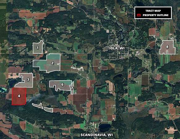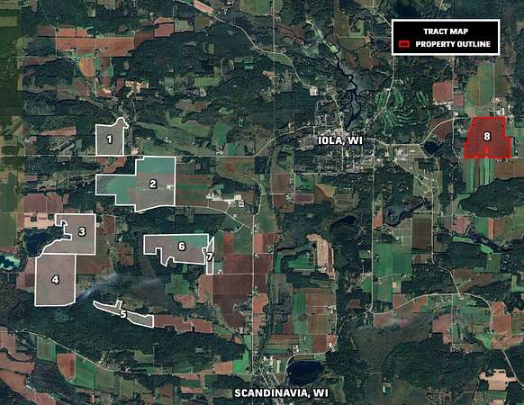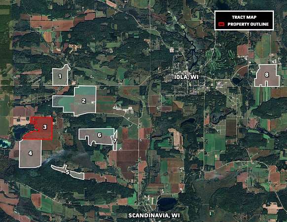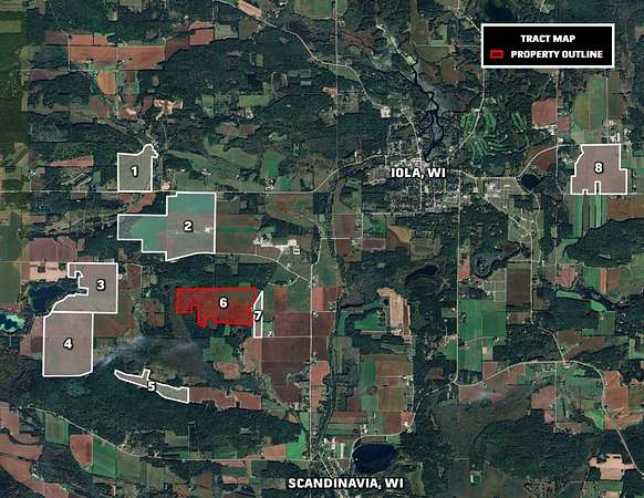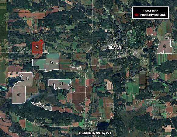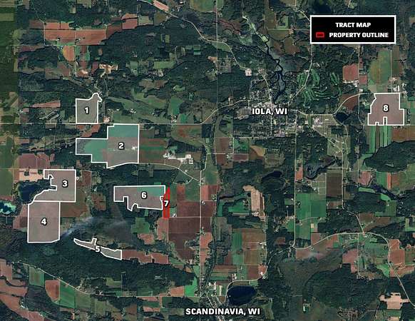 Do not miss the unprecedented opportunity to own this impressive portfolio of farmland in a prime location just off Highway 161 near Iola and Scandinavia. These eight tracts are ideally located in the heart of Wisconsin's Central Sands region. This region, particularly around Iola and western Waupaca County, features mainly Class II soils, comprised of sandy loams, with abundant groundwater and reliable irrigation, which makes it an ideal area for producing a wide variety of crops. Specialty crops such as potatoes, sweet corn, green beans, carrots, peas, onions, and cabbage are planted here, benefiting from the region's optimal growing conditions. Additionally, row crops like corn, soybeans, and wheat are commonly grown alongside alfalfa for forage. The area is also known for seed corn and specialty seed production, as well as nursery stock and sod. The rich agricultural landscape allows for multiple cropping cycles and supports both large-scale farming operations and one of the most versatile and valuable farming regions in the state. The area offers excellent soils, and five of the eight tracts are irrigated.