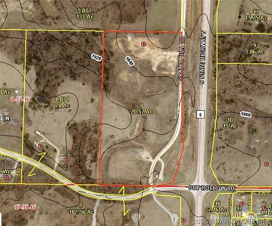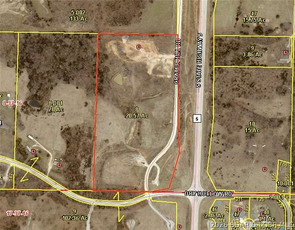 Developers and investors - take notice. This 20.57-acre tract just 3 minutes south of Camdenton along State Hwy 5 at Dry Hollow Rd is strategically positioned for commercial or residential type development. With Agricultural zoning and located outside city limits, the property offers flexibility for a wide range of uses beyond the norm. The level terrain supports efficient site development, and highway frontage provides excellent visibility and access for operations such as a UPS distribution hub, shop rental complexes, contractor yards, equipment dealerships, concrete or asphalt facilities, or other ventures like a residential neighborhood. Public water is located across Dry Hollow Rd and electric is accessible nearby, helping streamline utility planning. A pond on the property adds functional water access and site character. With no HOA restrictions and strong regional connectivity on the State Hwy 54 and State Hwy 5 corridor, this parcel presents a rare opportunity for scalable development in a strong growth corridor with high traffic exposure. Call or text for more information!