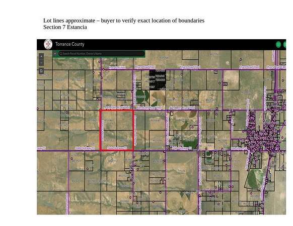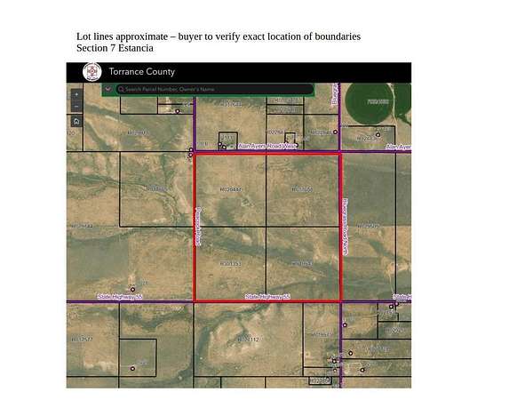 From Albuquerque take I-40 E. Go for approximately 35 mi.Take exit 196 toward NM-41/Howard Cavasos Blvd. Turn right onto Howard Cavasos Blvd N (NM-41) toward Estancia. Go for 17.2 mi.Turn right on NM-55. Go approximately 5 miles. Section 7 is on the right. The first corner is at Bluegrass and Hwy 55. The other sides are Peacock Road and Alan Ayers Road West.