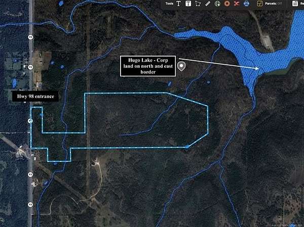 Cedar Trail Retreat is a hidden gem totaling 104 acres of lush, secluded land in Hugo, Oklahoma. This picturesque property offers the perfect blend of privacy and accessibility, located along the scenic SH 93. Towering oak, pine, and cedar trees blanket the land, creating a serene and thriving wildlife habitat. The property's rolling elevation changes add depth to the landscape, complemented by two tranquil ponds and multiple captivating rock creek beds that flow during wet weather. Bordering Corps of Engineers state land to the north and east, Cedar Trail Retreat provides direct access to additional outdoor recreational opportunities, including hunting and nature exploration. The vast network of trails invites ATV and UTV enthusiasts to adventure across the property. A cleared area at the entrance is primed for a camper site or a future homesite, offering a convenient starting point for your dream getaway. Just minutes from Hugo Lake, spend your days fishing in its peaceful waters or relax at the nearby Choctaw Casino. Whether you seek adventure, relaxation, or a place to escape into nature, Cedar Trail Retreat provides it all. Perfect for outdoor enthusiasts, hunters, or investors, this property is a rare find. Conveniently located 30 minutes from Paris, TX, and only 2.5 hours from Dallas, Cedar Trail Retreat offers the ideal combination of seclusion and convenience, making it a truly exceptional retreat for those in search of adventure and tranquility.