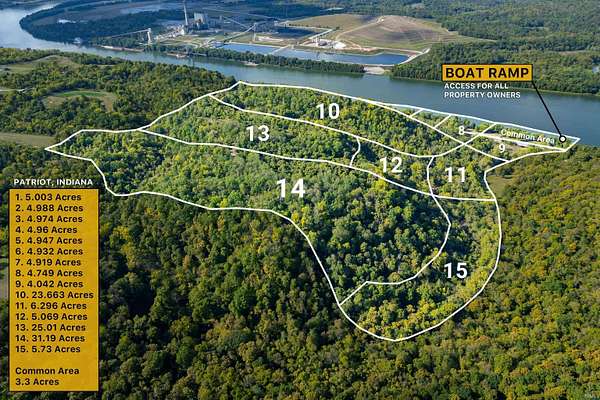 Tract 1 offers a fantastic opportunity to own 5.003+/- acres on the Ohio River! Prime Location! Nestled along the Ohio River with stunning waterfront views and direct access to the water. Ideal for building a dream home or using as a recreational getaway. Enjoy access to a 3+ acre common area with a private boat ramp, provided to all landowners! Additional Acreage available: Potential Commercial space & Larger wooded parcels off the water are also available, with the benefit of retaining access to the shared amenities. Water, electric, and fiber services are available, ensuring convenience. With easy access to Cincinnati, Madison, and Louisville, you'll be close to vibrant city amenities while enjoying the tranquility of riverside living. Whether you're looking for a peaceful retreat, a place to build your future home, or an investment opportunity, Tract 1 delivers exceptional value! Patriot, Indiana, and the surrounding areas offer a charming mix of outdoor recreation, historical exploration, and local entertainment. Local State Parks: Big Bone Lick State Park & Clifty Falls State Park. Rich with history: explore Museums, historic homes, & cultural landmarks. Don't miss the Switzerland County Wine Festival! Minutes from Belterra Casino Resort & Lawrenceburg Speedway. Short-term owner financing & potential for trade provide flexibility for buyers. The seller will provide a survey at closing, saving you time and expense
