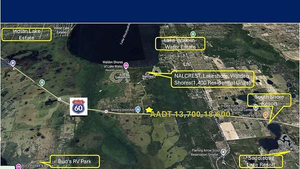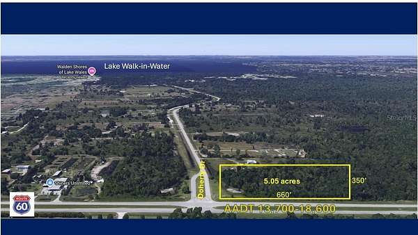 A prime corner lot at the intersection between SR 60 and Doherty Dr, Lake Wales. This property is currently zoned as Agriculture/Rural Residential(ARR), which allows a series of land uses, like religious institution, isolated convenience store, mobile home park etc (see attachment for all allowable land uses under ARR). Also, it can be rezoned to commercial use and has great commercial potential. Its frontage along with SR 60 has 660 feet. Strong, unobstructed visibility from SR 60; 13,700-16,800 Annual Average Daily Traffic (AADT); and easy ingress/egress with corner positioning, turn lanes and median cuts. Adjacent to Doherty Dr., the only access road leading into a 1,400-unit residential community, including NALCEST, Walden Shore of Lake Wales, and Lakeshore. There are other multiple communities within 7 miles, including Indian Lake Estates, Lake Walk-in-Water Estates and Saddlebag Lake Resort etc. Gold Coast Utilities is nearby and willing to extend utilities to the site. Size is 5.05 acres and flood zone X. It has enough space and is easy to develop businesses to serve locals. Don't miss this investment opportunity. Seller Financing available. The cross-street property (TB8427879) is also available.