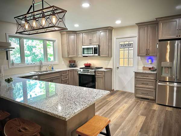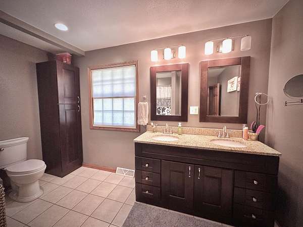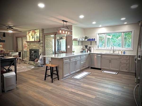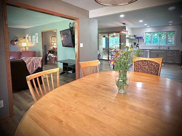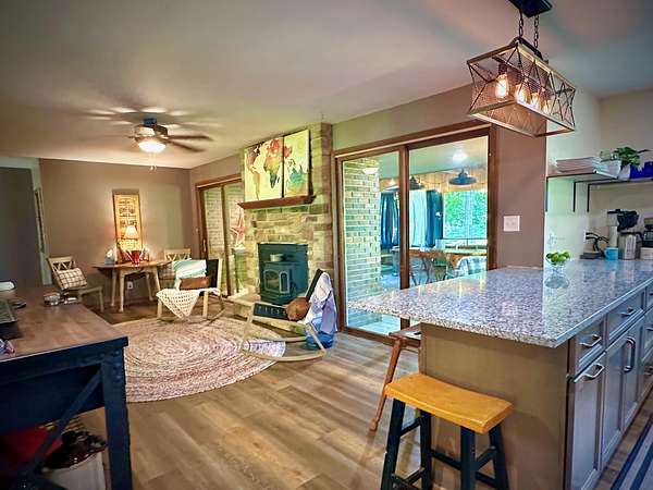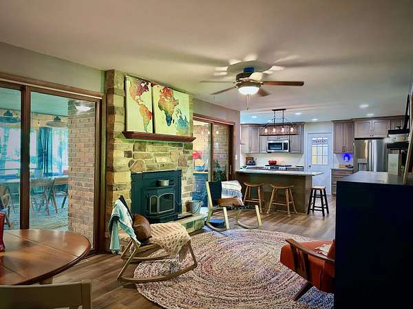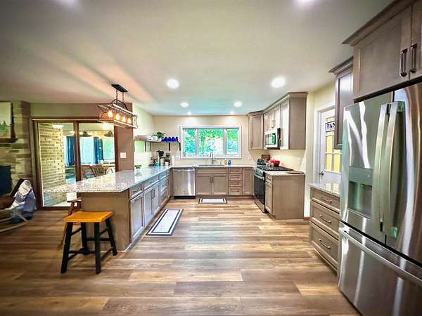 Welcome to this charming 4-bedroom, 3 bath brick ranch on 5 acres of private AG-zoned land. Located in Winnebago County and the Stillman Valley (Meridian) School District, this home offers both privacy and convenience. Inside, you'll find a bright entry with new flooring and light fixtures, leading to a spacious living room and cozy dining area. The fully remodeled kitchen features granite countertops, stainless steel appliances, and a farmhouse sink. A first floor laundry and bathroom complete this side of the home. Primary suite includes a luxurious bath with dual sinks, a tub/shower, and a large walk-in closet. Three additional bedrooms share a full bath with dual sinks. The lower level offers an office, bonus room, second kitchen, and plenty of storage. Outdoors, enjoy a 40' x 90' barn, wooded areas for exploration, and ample space for a garden. Don't miss this perfect blend of privacy and potential.