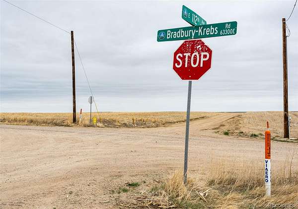 Take I-70 to the Strasburg exit, turn right or East on Colfax Drive to Strasburg Road/Monroe, turn left /North drive, stay on Strasburg Road for 8.9 miles to 112th, take 112th East to the crossroad Bradbury Krebs, and continue East over /through Bradbury Krebs on the unmaintained county road 112th to the land. Signs are located at the corner of 112th and Bradbury Krebs, as well as on the property