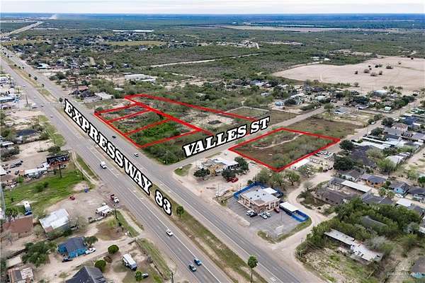 Est $6,467/moFour lots in Sullivan City offered as one package and must be sold together. Suitable for a variety of development opportunities. Located in a high traffic area, these locations ensure high visibility and convenience for various types of business ventures. Property features frontage and visibility along Expressway 83 with additional access from Valles Street. Information is deemed reliable but not guaranteed. Buyer and buyer's agent to verify zoning, utilities, access, and intended use. Contact listing agent for additional details.