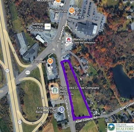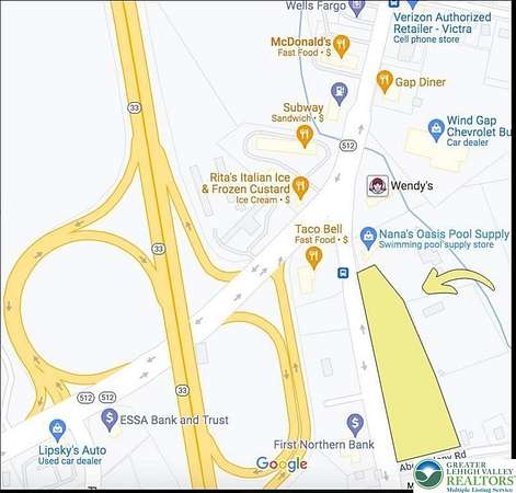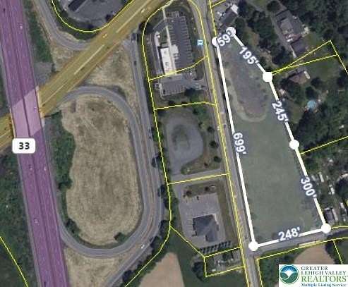 For Sale, Ground Lease, Build to Suit - Shovel ready Highway Interchange zoned 2.9 acres at the foot of the Rt 33/512 Wind Gap interchange. Corner lot with over 900 ft of road frontage. AADT 53,000(Rt 33/512). Part of the bustling Northampton County, Pa Rt 33, nearby St Lukes, LVHN, Colton, and many restaurants and fast food including the new Starbucks across the street. Approved for 3 story 31,050 SF Medical Clinic building. Engineering plans available upon request. Many other commercial use rights including Hotel, Convenience store, Storage, Fast food, Auto (check with Plainfield Township on possible uses including mixed use/apartments). Owner will subordinate, finance, build to suit for financially strong tenant. Most improvements completed. Water and sewer to site. 90 min to NYC and 60 min to Philadelphia - great opportunity with very flexible owner financing. All offers will be reviewed.