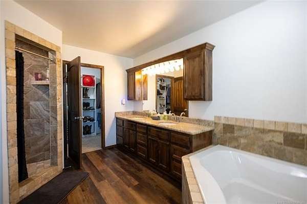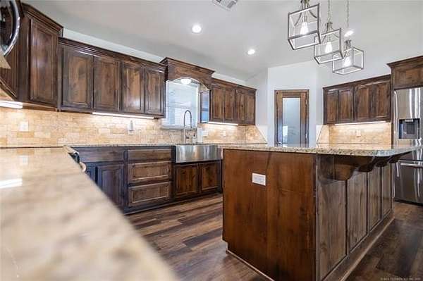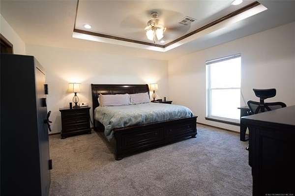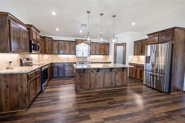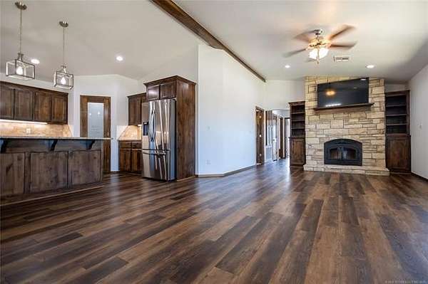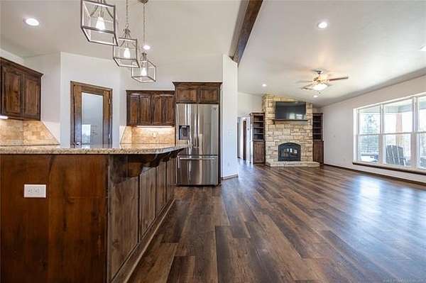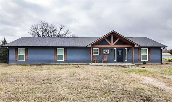 Est $1,992/mo3 bed, 2 bath home near Arbuckle Lake! Open-concept living and dining area with a cozy fireplace. Large kitchen with granite countertops and a pantry. Primary ensuite features double sinks, soaker tub and a walk-in shower with dual shower heads. Situated on a beautiful 4.84-acre wooded lot with a storm cellar and covered porches!