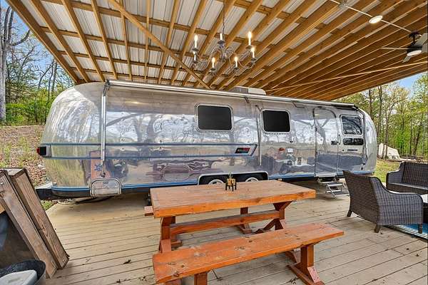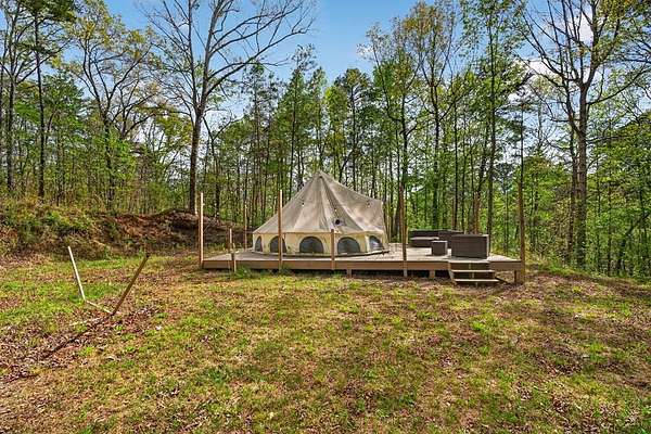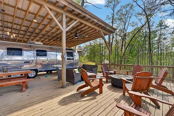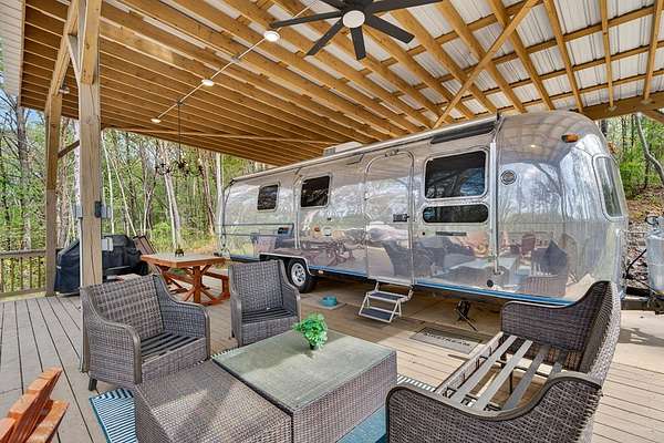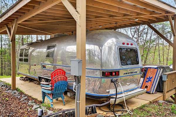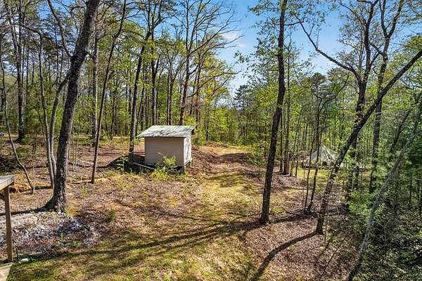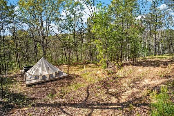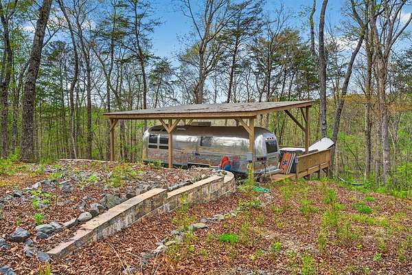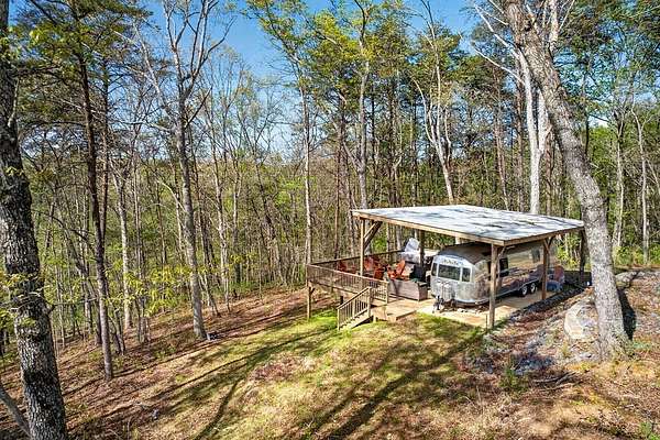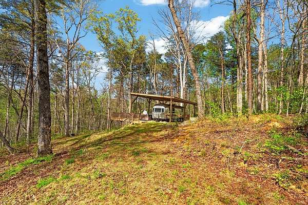 Welcome to a place of peace and quiet (well, other than the wildlife). This 7.27 acre unrestricted property sits privately in the woods with plenty of frontage on Harris Creek and comes with a completely revamped 31 ft. 1975 Airstream Sovereign with a covered deck and a hot tub. There's also a yurt platform deck and a shed-style building with a small bathroom. Utilities are in place. Surrounded by woodland mountain flora such as laurels, wild azaleas, rhododendron, etc as well as towering hardwoods. The terrain is flat at the top where the camper, yurt, and shed are located, sloped down toward the creek, but plenty of wide, solid, flat terrain beside the creek. Harris Creek is a noisy flowing creek (not so much at the moment, due to lack of rain) averaging about 7 feet wide, more or less. Located on a gravel road but with quick and easy access to Hwy 382 from Berean Church Rd. The turkey and deer love this property too! Close proximity to Carters Lake boat ramps and recreational areas, WMA lands, vineyards, and other outdoor attractions. Enjoy downtown Ellijay attractions, such as boutique shopping and restaurants, as well as Gilmer County's famous apple orchards and vineyards!