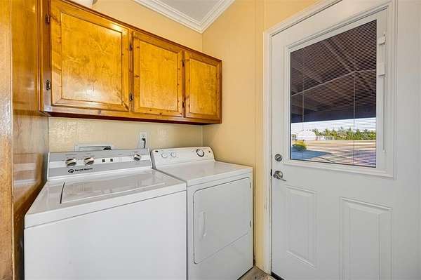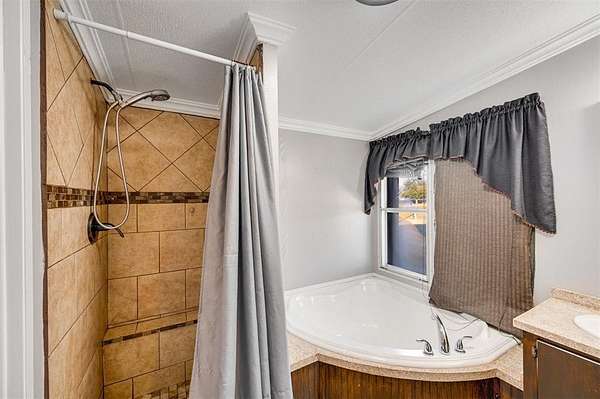The home has a split layout with a large primary ensuite that includes a big soaker tub and a tiled walk-in shower. There are two dining areas plus a kitchen bar, and the kitchen has a cute coffee bar setup. The other two bedrooms and main bathroom are on the opposite side of the home. A patio on the north side gives you shade in the summer, and the well-kept Bermuda grass lawn across the full 1.5 acres gives you plenty of space for outdoor play, gardening, or animals.