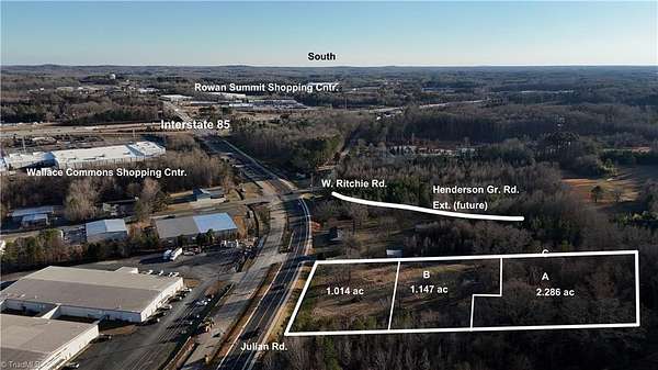 Commercial land 1/4 mile from Interstate 85 ramp. Zoned Highway Buisness for use as commercial, retail, appartments, buisness or office. 280' on Julian Rd. & 575' along Suzannes Rd. proposed to be paved. Water and sewer available along Julian Rd. Convenient (1/4 mile) from Wallace Commons Shopping Center as well as Rowan Summit Shopping Center & Interstate 85/Julian Rd. intersect which includes Kohls, Belks, Michaels, Olive Garden, Starbucks, Dicks Sporting Goods, Longhorn Steak House, Texas Road House as well as other assorted retail and resteraunt establishments. High traffic & visibility area. These parcels are suitable for retail, multipule appartments and commercial uses. Lots: 280' (Julian Rd) x 575' (Suzannes Rd.). Structures are uninhabitable.