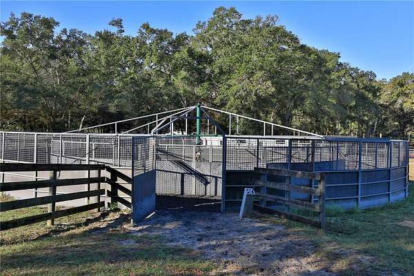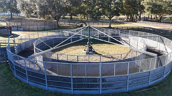 Equipped with a round pen, Eurociser, and loading chute, this property is set up for optimal training and care of your horses. Enjoy direct access to a 5/8-mile racetrack within the complex, making it an excellent choice for day-to-day training or for competitive riders.