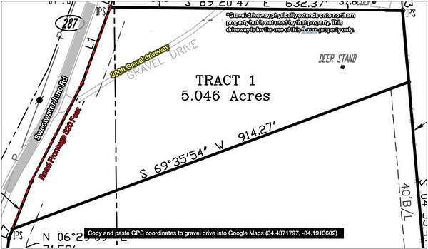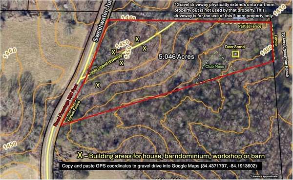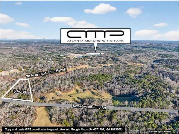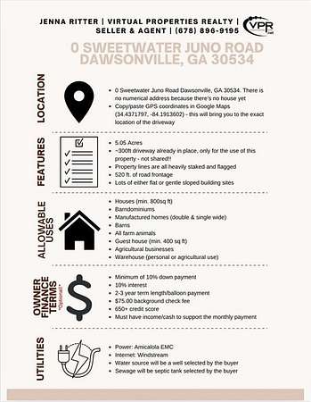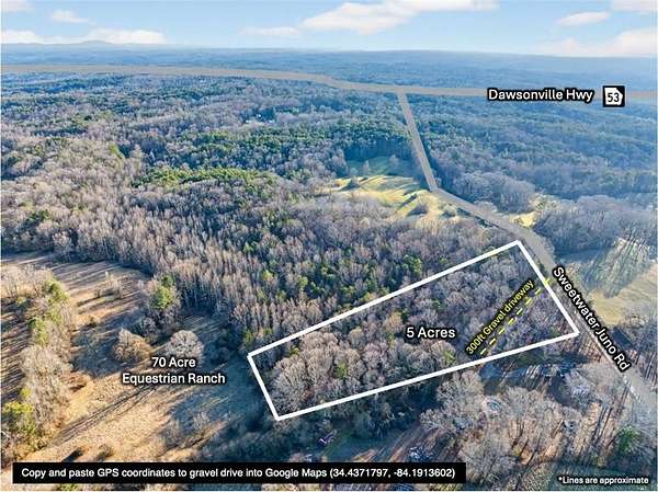 *Seller is also the agent!* To find the property's specific location, Copy and paste GPS coordinates into Google Maps (34.4371797, -84.1913602). FLAT 5 Acre tract in Dawson County with a 300ft driveway already in place! Secluded off of quiet, paved county maintained Sweetwater Juno Road, where Agricultural zoning requires a minimum of 5 acres - never worry about high density subdivisions anywhere near here. No nosy neighbors remotely in sight, or an HOA dictating what you can or cannot do on your own property! Perfect for absolutely ANYTHING - slab home, manufactured home, basement home, barndominium - YOUR CHOICE! Accessory buildings ALLOWED - build a barn for your animals or agricultural business. Sick of your adult children living at home? Or have nowhere to put your mother-in-law? Or want passive income from hikers, hunters or Dawson Motor Sports? Problem solved - you can have TWO residential structures on the property! The main house must be at least 800 sq ft, the secondary one must be at least 400. Uniquely located - almost in the National Forest, yet practically next door to the Atlanta Motorsports Park where multi-millionaires from all over the country store and drive their Porches and Lamborghinis. Travel often? Only 55 minutes to the North Springs MARTA station. For those that wish to check the site out on their own - please note the +/- 300ft gravel drive extends onto another property, but is not used by that property or any other property. There is a steel wire cable across the gravel drive at the edge of the property line. Feel free to park your vehicle on the gravel drive while you walk the property. There is a partial line wire fencing along southern road frontage, gravel drive and northeastern property line with full fencing along rear (eastern) property line (see photos). Large deer stand near rear of property for immediate use overlooking open area of Club Moss. Rear of property backs up to a $3M+ 70 acre equestrian ranch. Property will be served by well and septic (selected by buyer). Full perimeter is flagged, with rough trimmed foliage to navigate at your leisure (don't forget your boots and long pants). Owner financing is available. Terms: 10% down, 10% interest rate, 3yr term/balloon (negotiable). Land or residential trade also considered.