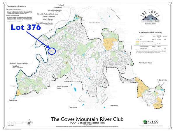 Enter the Coves gates on the corner of Johns Ridge Pkwy and Valley View Circle. Continue for 1.5 mile and turn left on Table View Ln. Go to the end and follow the road to the right at the cul-de-sac circle. Lot 376 is on the right. Gate code is required.