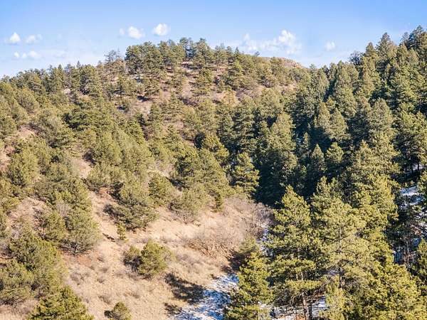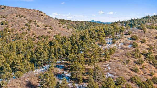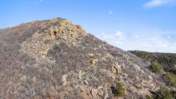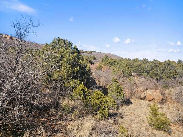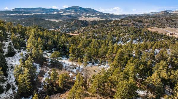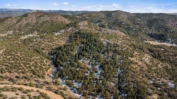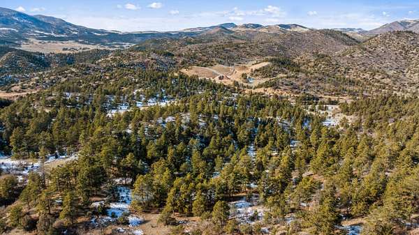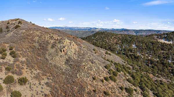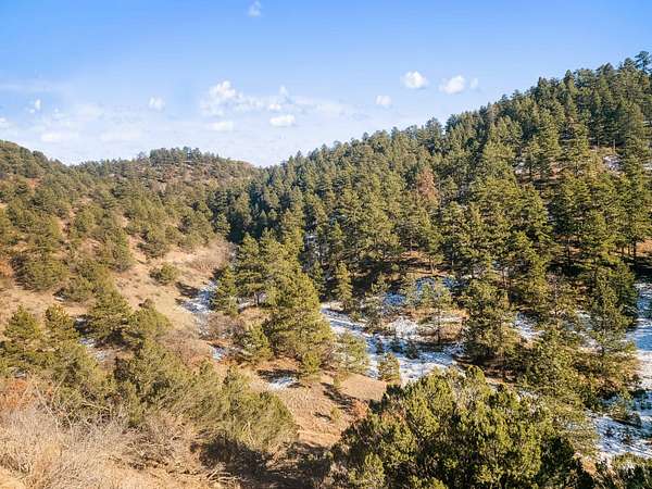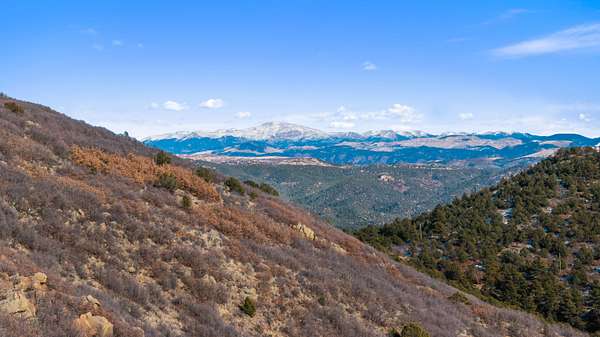 The land features extensive tree cover, including ponderosa pine, aspen, pinon pine, and mixed native vegetation that provides both visual diversity and quality wildlife habitat. Topography across the property is highly varied, with elevated ridgelines, rocky peaks, natural canyons, and scattered rock outcroppings that create numerous vantage points and sheltered areas. From higher elevations, long-range mountain views extend west toward the Sangre de Cristo Mountains, with additional views of Waugh Mountain and even Pikes Peak visible on clear days.