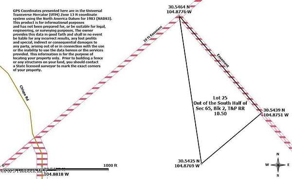 Choose a 10-acre parcel out of the south half of Sec 65 Block 2 T & P in the northwest portion of Presidio County. Lots 25-31 are $4800 each and have access from Chispa Candaleria Rd. Each lot is 10 acres+. See maps of available lots in the photos. Enjoy the freedom of off-grid living in Texas. Located 45 miles south of Van Horn, TX, and is 40 from Valentine, TX and 75 miles from Marfa, TX. No HOA. No zoning. Build your dream home, cabin, tiny home, mobile home, RV, camping, livestock/horses, ATV riding, and hunting. Peaceful living at its best in friendly West Texas where the sun & stars shine brightly. Amazing views. Invest in land while it's affordable! Most buyers in the area utilize hauled water, solar panels, propane, & state approved composting toilets. Buyer is encouraged to verify all information with the appropriate Presidio County office/s. Address is for listing purposes and is not a searchable address. Serious inquiries only, please. 2024 Parcel ID 10045 for appraisal district website. Each lot will be assigned a new parcel ID number. Lots 1-10 along the river are $7900 each, Lots 11-24 are $5800 each. Approximate coordinates for the half section: 30.538 n, 104.881 w. Paste this maps link in a browser: maps.app.goo.gl/1zfYSps1ncYKDftp6