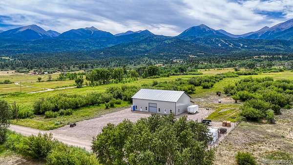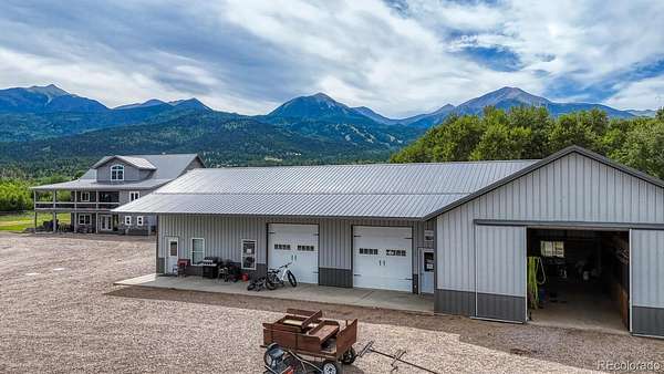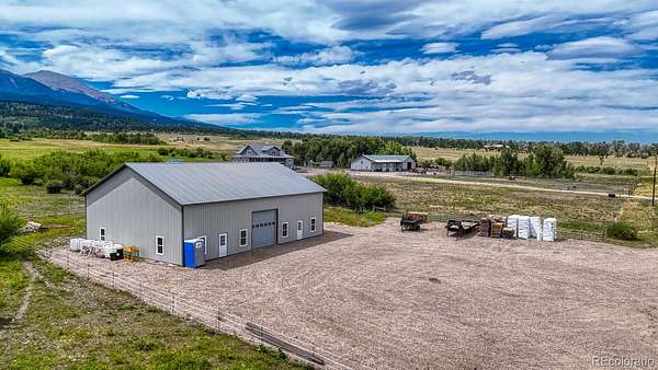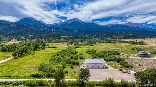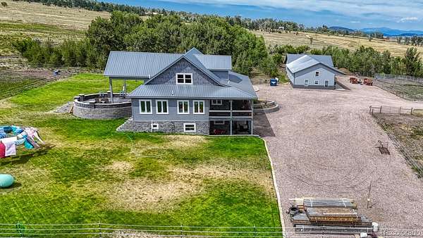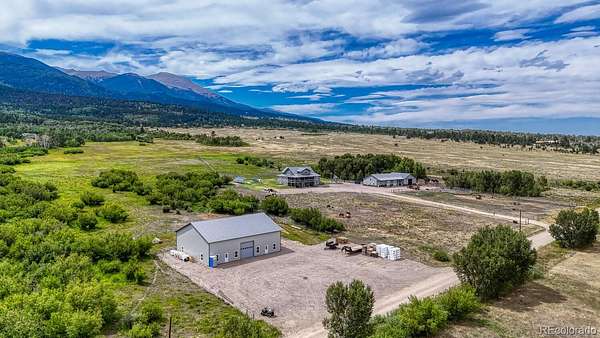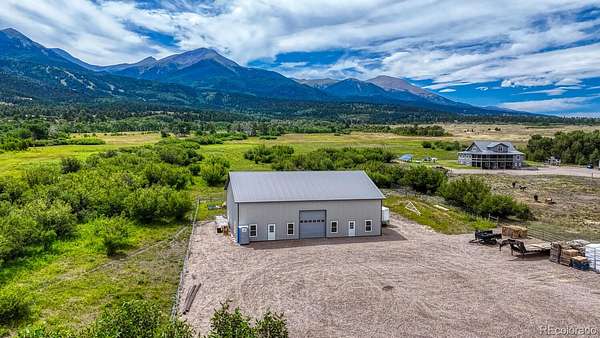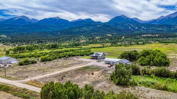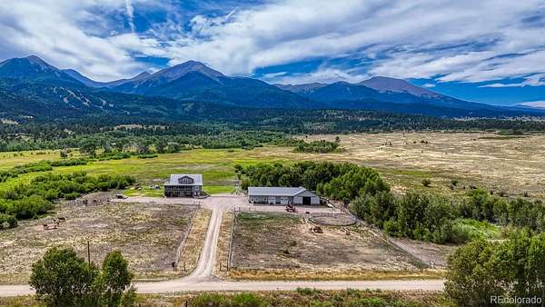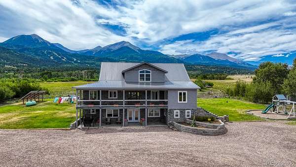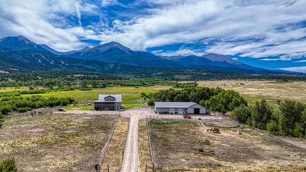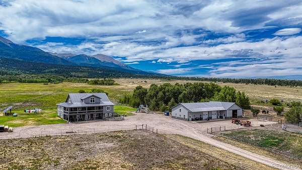 Located off Muddy Road on Westcliffe's sought-after west side, this one-owner, Amish-built home delivers peace, space, and unmatched views. Spanning 4,960 square feet, the home was thoughtfully designed to capture the full sweep of the Sangre de Cristo Mountains from nearly every room. Middle Taylor Creek meanders through the property, adding to the quiet charm of the lush lawn, play area, and open fields. With 5 bedrooms, 4 baths, an office, and generous living space, there's room for everyone. The lower level includes a full kitchen and separate entrance, ideal for guests or rental use. The main level impresses with vaulted ceilings, oversized windows, and open living spaces that bring the outdoors in. A spacious mudroom and laundry area boost functionality. The land is fully fenced and cross-fenced with two pastures, a paddock, a horse barn, and a second barn with radiant heat and concrete floors. A cozy bunkhouse with its own septic system offers added flexibility.