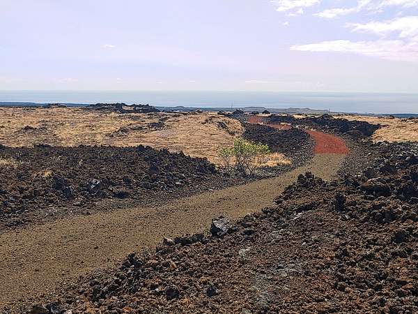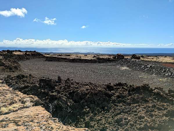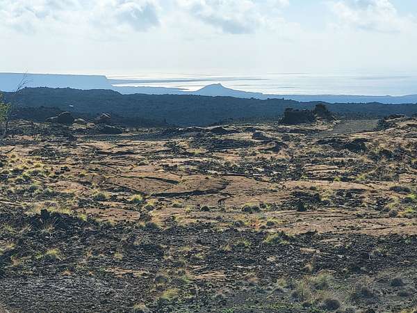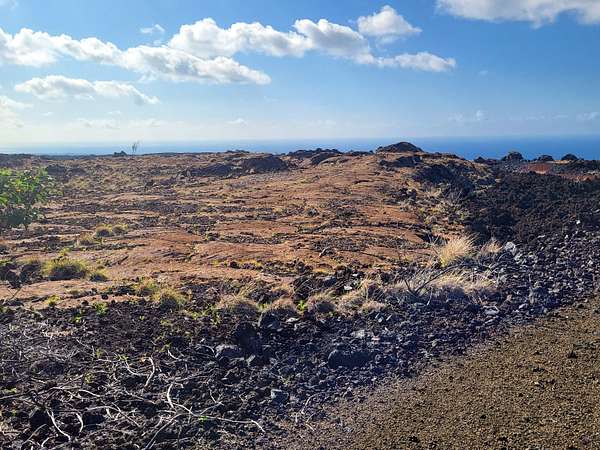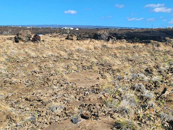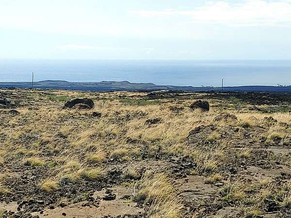 3.3 acre lot perched near the east end of Tapa Drive in the Hawaiian Ocean View Ranchos subdivision on Hawaii Island. The lot is selectively graded, providing driveway access to a prime house site and an expansive graded plot also suitable for a house, additional structures and a septic field. Approximately half of the 3.3 acres surface features pahoehoe lava slabbing. Using post and beam type foundation, a home could be constructed on the pahoehoe without additional grading, thus preserving the site's natural character. The already graded areas are purposely contained within the portion of a collapsed lava tube that transits the lot. The site offers a spectacular 90 degree-expanse view of ocean, coastline and sunsets. A border of the Kahuku-Pohue unit of Hawaiian Volcanoes National Park abuts the Ranchos subdivision just east of the lot. Pohue Bay beach is 2 -3/4 miles by ancient foot trail from a nearby trailhead. The lot has grid-electricity available. Ocean View Town Center is four miles or approximately ten minutes away and has three grocery stores, post office, restaurants, hardware store, and three gas stations. Drive-to beaches (Punalu'u and Ho'okena) are approximately 30 minutes away via Highway 11.