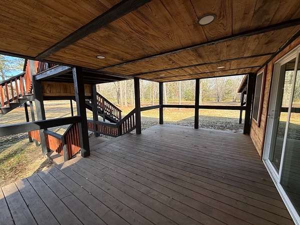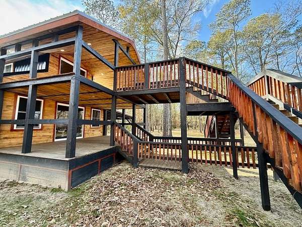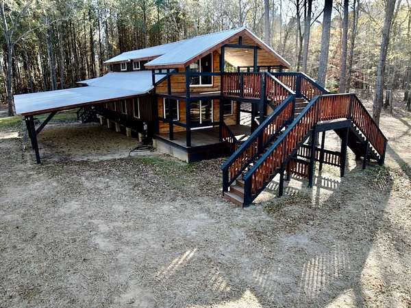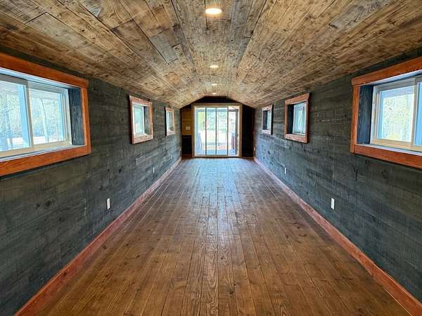 The cabin's lower level consists of an open-concept layout with one bathroom, while the upstairs features a narrow loft-style space with several windows and small front and back porches. The loft's beautifully refinished wood ceilings and floors provide the perfect location for displaying taxidermy mounts. A dual-access front porch provides entry to both the cabin's main level and the upper story, creating a rustic aesthetic that beautifully complements the property.