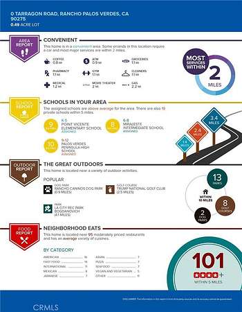 Get away from it all and enjoy a secluded, less-congested part of the Palos Verdes Peninsula with your dream ocean view home at the end of a cul de sac on Tarragon Road! You will be close to nature right in your backyard, with direct access to some of the best hiking areas on the hill. The Three Sisters Reserve opens up beyond your rear property line, giving you a gateway to SoCal's natural landscape and wildlife from the privacy of your own property. Just shy of a half acre with an unbeatable ocean view, this is one of the last vacant buildable lots in Rancho Palos Verdes. A harbor or Orange County view is nice - but an unobstructed panorama of Santa Catalina Island and the Channel is so much better, and on clear days you can even see Santa Barbara Island! It is quiet and peaceful here, far enough from the drive to limit road-noise and more stars in the night sky without city lights to drown them out. You can hear sea lions near Terranea calling to each other on a summer evening and enjoy the winter whale migration from the tranquility of your own retreat. The Mediterranean climate is ideal at Abalone Cove. When it is cold or hot elsewhere on the Peninsula, it is more temperate here. Located near beach access, shopping, fine dining, world-class golf courses and award-winning Palos Verdes Unified schools. This is your opportunity to snatch up a blank canvas and realize your dreams of peace and calm within the hustle and bustle of LA County. Soils Report available upon request. Seller also has fire department approved/stamped architecturals for water and (fire truck) access, as well as fire flow testing from water purveyor, and soil testing on existing shared driveway to meet the fire department's All Weather Access Requirements. Documents to be made available to Buyer with an acceptable offer. Lot lines in photos are for illustrative purposes only and not to be relied upon.
