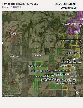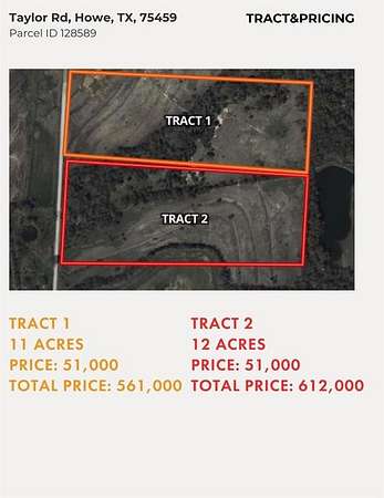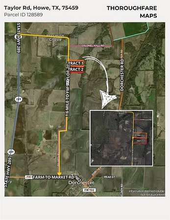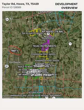 A 23-acre tract of land is available for purchase in Dorchester, Texas, approximately 10 minutes from the Texas Instrument in Sherman, the largest investment in the area. The property is situated along Taylor Road in Southern Grayson County. A future minor arterial road that will directly connect with TX-289 and I-75, an ideal site for commercial or residential development targeting the area's growing workforce. The City of Dorchester provides water services to this area. The land can be purchased in two parcels (12ac, 11ac), each priced at $51,000 per acre; all 2 parcels have frontage with Taylor RD. For further details, please refer to the attached image or contact the listing agent. Actual size will be determined by survey.