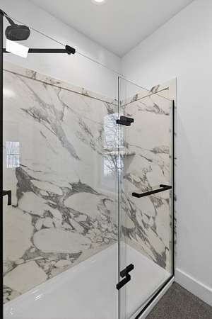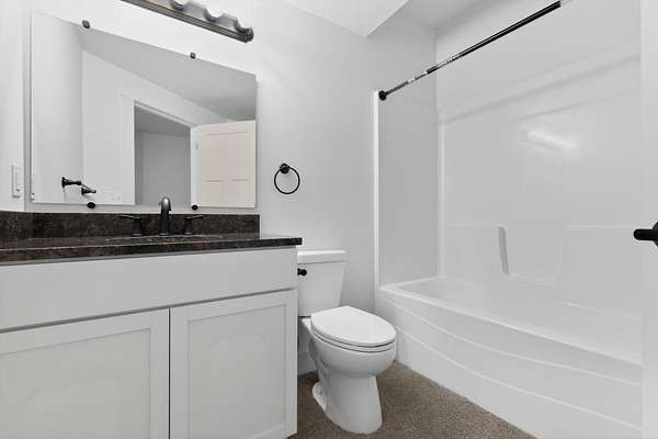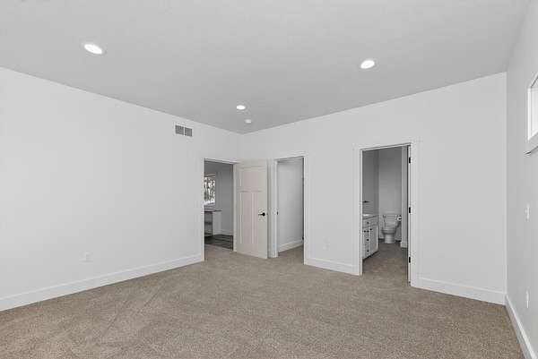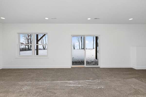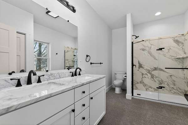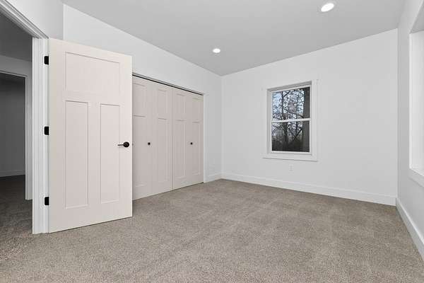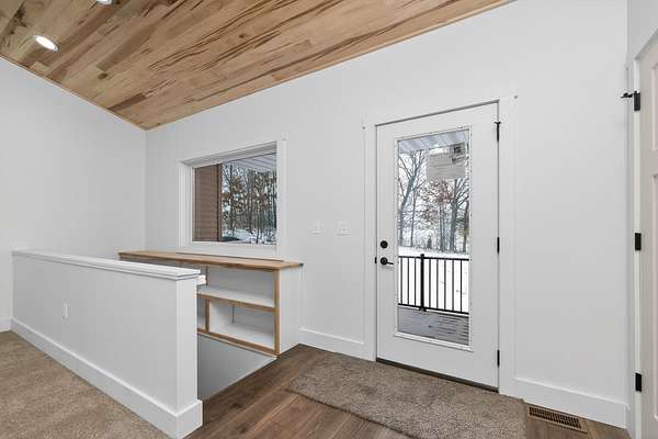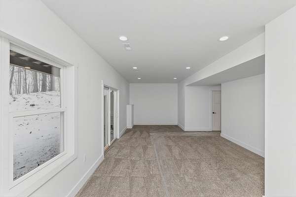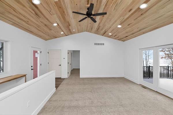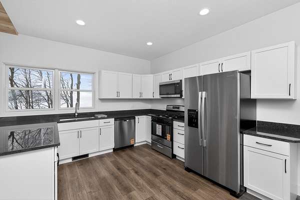 This brand-new three-bedroom, two-and-a-half-bath, 2,136-square-foot ranch house is nestled among mature trees on a 2.3-acre tract with a broad lawn and 523 feet of waterfront on a 25-acre private lake with abundant wildlife and waterfowl. The interior, mostly carpeted with an entryway of hardwood-look vinyl, has a main-level living area with a vaulted paneled ceiling and access to a deck; a kitchen with stainless appliances and a peninsula with bar seating; a primary bedroom and primary bath with dual vanities, standup shower, and large walk-in closet; and a half-bath with laundry connections. Downstairs are a large living area with access to a covered patio; two bedrooms; and a bath with tub. The property includes a two-car attached garage.