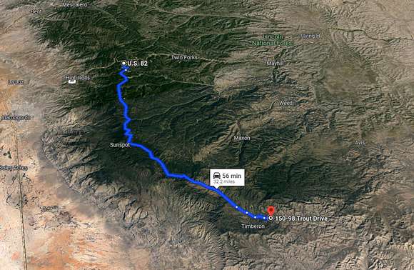 From US-82, head south onto NM-130 for 1.8 mi. Turn right onto Sunspot Hwy for 14.2 mi. Continue straight onto Sacramento Canyon Rd for 12.7 mi. Continue onto Fs 537/Sacramento River Rd. Continue to follow Sacramento River Rd for 1.0 mi. Turn left onto Bobwhite St for 499 ft. Turn right onto Merlin Dr for 0.8 mi. Turn left onto Hoover Dr for 0.9 mi. Drive to Trout Dr for 0.7 mi. Turn left onto Marlin Dr for 335 ft. Turn right onto Trout Dr for 0.7 mi. Property is on the right.