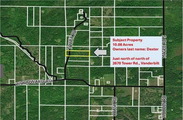 US 131 S To Thumb Lake Road; Turn Right onto Camp Ten Road; Continue to Woodward Road; Turn Left onto Woodward Rd, and follow for 3 miles to Tower Road (seasonal); Turn Left onto Tower Rd head north 0.3 miles. Sign on the right (most of the property is on the east side of the road).