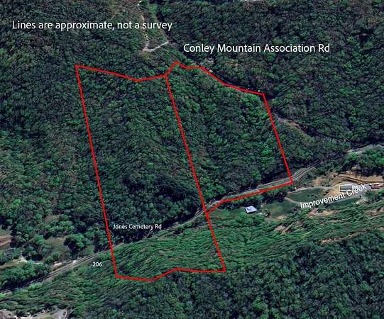Conleys Creek rd to a right on Sam Dills Rd, left on Treehouse, property starts just past the little creek cabin at 206 Treehouse. Jones Cemetery rd and the next valley on left before the corner tract at Conley Mountain Association.