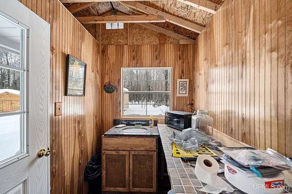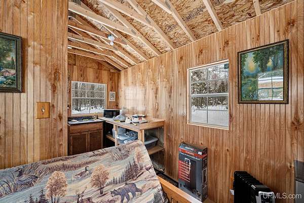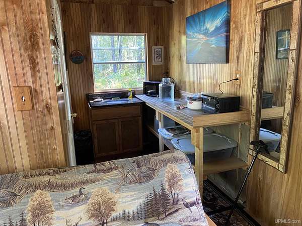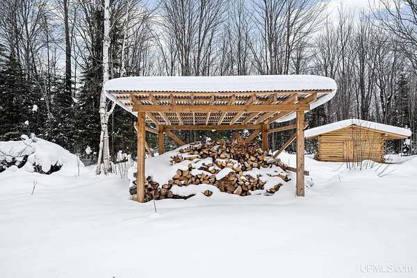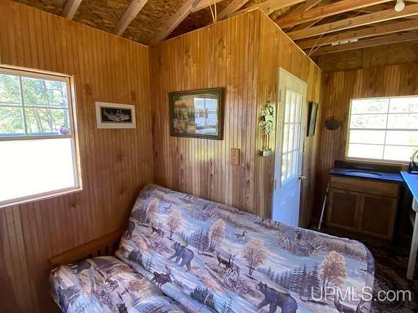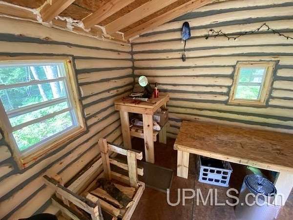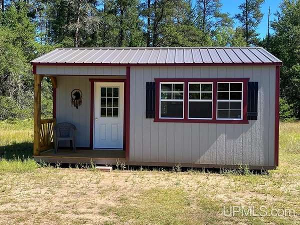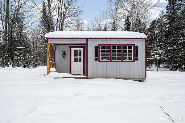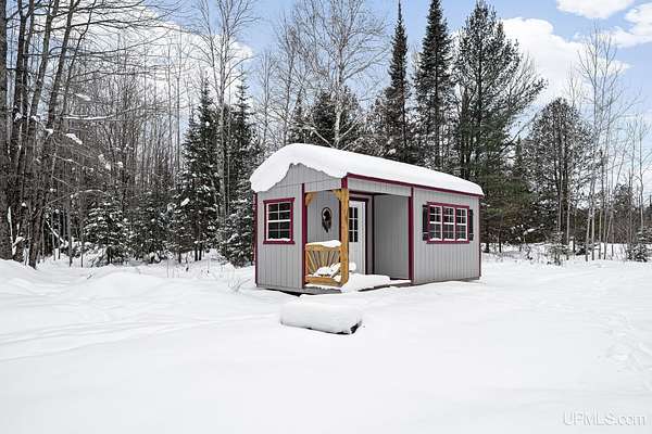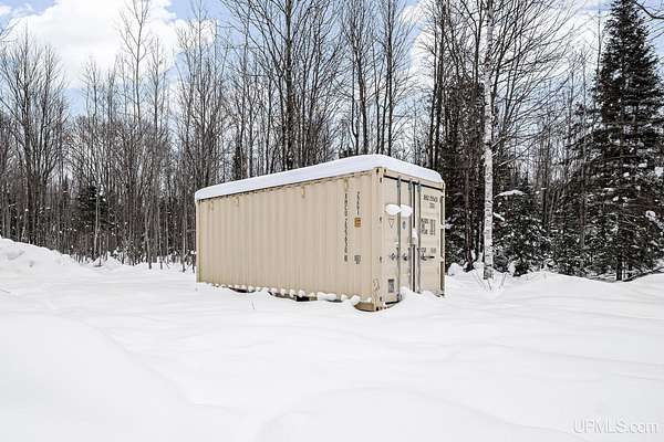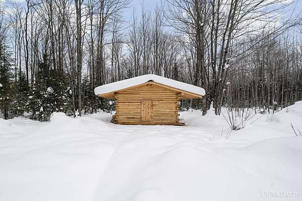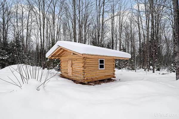 Tucked away in the heart of Mathias Township, this secluded 20-acre property offers a rare opportunity to own a versatile recreational retreat just minutes from Trenary. Surrounded by mature hardwoods and abundant wildlife, the land provides exceptional privacy and natural beauty, making it ideal for outdoor enthusiasts, hunters, or anyone seeking a peaceful escape. The terrain is predominantly high and dry, with a few low areas that add character without limiting usability. The property features multiple well-built structures that enhance both function and value. A handcrafted 10x12 Aspen log "trapper's" cabin, constructed from logs harvested directly on the land, delivers classic rustic charm. Complementing it is a Mennonite-built cabin from UP Shedquarters, thoughtfully designed with quality materials, including tongue-and-groove flooring, attractive wood interior siding, and a tiled sink area--well suited for guest accommodations, a hunting camp, studio, or creative workspace. A single-trip 20-foot shipping container offers secure storage for equipment and supplies, while a lean-to provides covered firewood storage. A recently installed gravel driveway and pad ensure convenient access for campers, trailers, or future development. Established trails weave throughout the acreage, making it easy to navigate and enjoy the land. Known for strong hunting activity, the area has produced multiple bucks on this parcel and neighboring properties. With electric and high-speed internet available at the road, this property presents an excellent opportunity for a future home site, recreational basecamp, or weekend getaway that balances seclusion with accessibility.