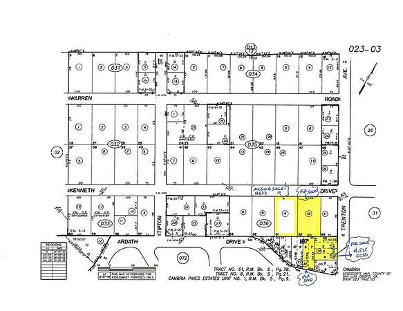 Three Separate Parcels being sold together! Kenneth Dr (100' x 175'), Trenton Ave (100' x 100') & Ardath Dr (50' x 150'+-). #575 on CCSD water list on Trenton Lots. Imagine owning all these lots in this park-like forest view private setting. Paved streets, not far to the ocean or the Fiscalini Open Space trails.
