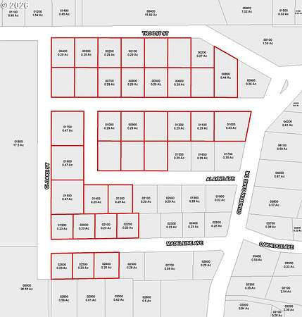 Discover a remarkable development opportunity spanning approximately 13 acres combined across the desirable Park Haven and Charter Tracts subdivisions. This acreage thoroughly includes platted roads and lots, ready for development. The properties feature 35 legal lots of record, with lot sizes ranging from 0.23 to 0.47 acres, and the majority averaging 0.29 acres. Six of the lots provide frontage on Troost Street, which is currently slated for annexation as part of the completed UGB Swap, a plan which has received the Governor's approval. Future potential is significant with the City of Roseburg's UGB Swap, which forecasts an opportunity for 7,500 sqft lot sizes. Adding to the appeal, the School District owns a large, adjacent 17.9-acre parcel. Essential services are readily available, including gas, water, power, and high-speed internet to existing homes. The City of Roseburg services the water system in the Charter Oaks area, ensuring reliable utility access for future residents. Roseburg Urban Sanitary Authority (RUSA) has recently approved complete sewer system plans for the area. Now is the time to prepare for the City of Roseburg's next expansion! Additional lots negotiable. Smaller lot combinations negotiable. Disclosure: Owner is a licensed real estate broker in the state of Oregon. The above information is believed to be accurate. All parties to perform their own due diligence.