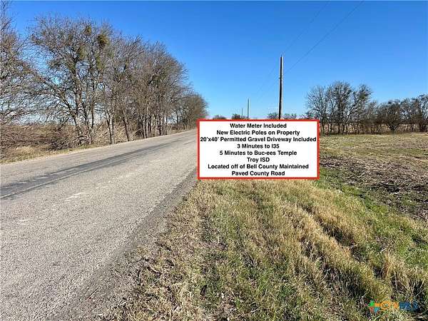 Brand New - First time this 1.15-acre lot has ever been available for sale. Great residential/commercial property. Highly acclaimed Troy ISD and located just 3 minutes from I35, and 5 minutes from Buc-ees Temple. Paved county road frontage, and paved all the way to I35. Water Meter is Paid For Already and is being installed soon, as well as a 20'x40' permitted gravel driveway entrance off of Bottoms East Rd. Just a few minutes from IH 35 and Temple! Look for white PVC Stakes at all property corners and PVC Stakes at the Mid-Way point on each lot to help identify boundaries. Exit 306 off I35, turn right on Bottoms East Road, 2.5 miles on Bottoms East Rd, the lot is located off Bottoms East Rd. Eligible to use the Texas Veteran Land Loan Program! Reach out for more details or go by and take a look!