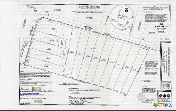 From I-35 go West on Main Street, Continue Straight onto Franklin Rd., in approximately 0.2 miles is the corner of Franklin and Rock Rd where plat map for Goates Estate is on the property.