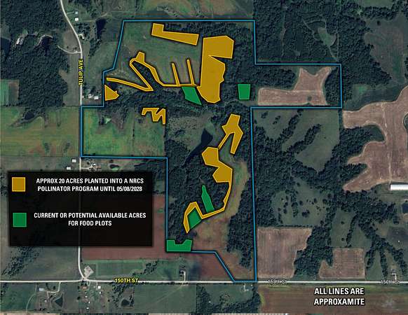 At the foundation of the farm are 79.71 FSA cropland acres, with 56.39 currently in production boasting a CSR2 rating of 46.1 and generating $8,700 in annual cash rent income. Nearly 20 additional acres have been seeded with a native conservation and monarch butterfly mix along the field edges and pond, creating excellent upland bird and deer habitat. These acres will remain in this quality cover until May 10, 2028.