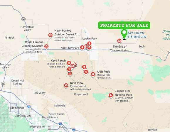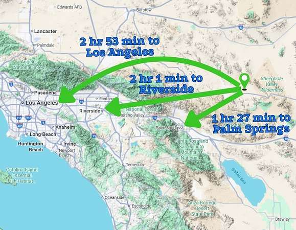 San Bernardino County's inland desert region delivers year-round sunshine, open landscapes, and affordable land opportunities compared to coastal California. The area supports off-grid lifestyles, small-scale homesteading, and community-driven living with major routes connecting to Palm Springs, Joshua Tree, and the greater Los Angeles area.