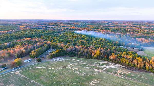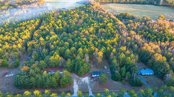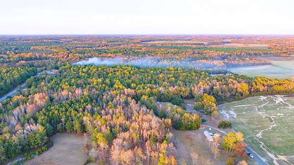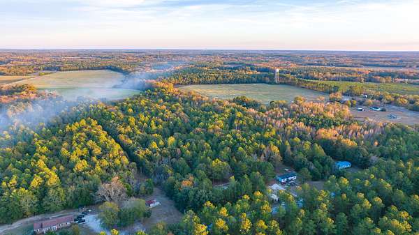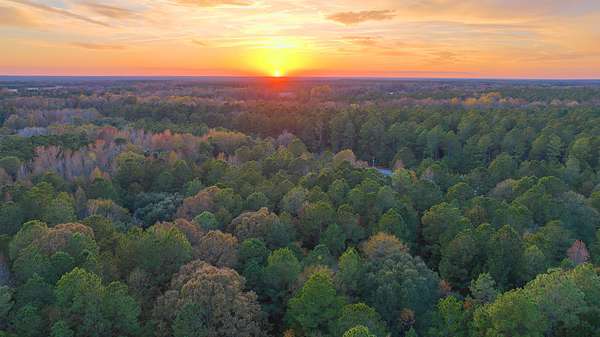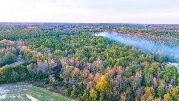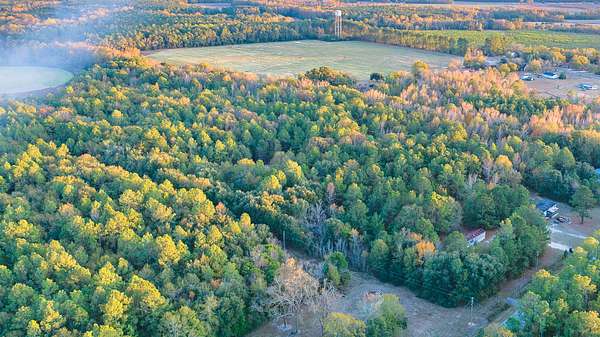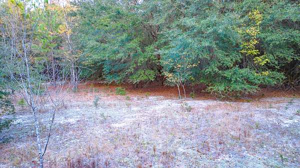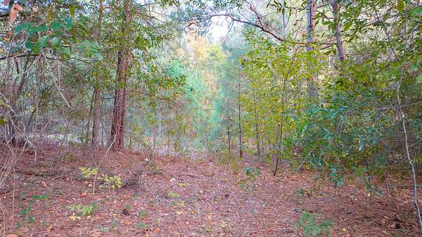 This 25.45-acre parcel is mostly flat and covered with mature pine and hardwood trees, with pine straw and leaf litter across the ground. A small area would need to be cleared for building, and the remaining land is continuous rather than divided into separate sections. The size and layout allow for a residence set back from the road, internal trails, or multiple land uses across the property.