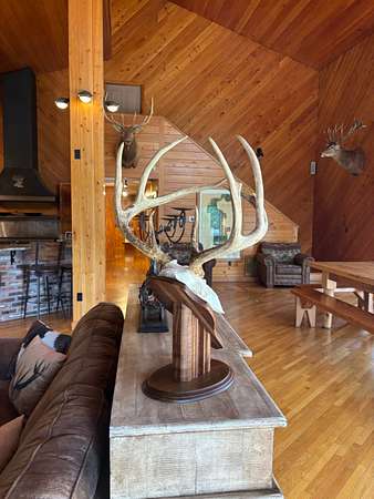 Skinning shed with walk-in cooler, equipment barn with private bays, and ample ATV and gear storage .