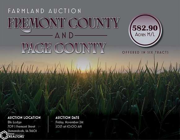 Major Fremont & Page County, IA Land Auction! I'm honored to represent the McLaren Family in the sale of 582.9 surveyed acres m/l of high-quality tillable farmland located just north of Shenandoah, Iowa in Fremont & Page County. The farm will be offered in six individual tracts, consisting of five tracts with high-quality tillable acres in addition to a large acreage with a well-kept house and multiple outbuildings. These tracts will be sold via Public Auction on November 21st, 2025 at the Elks Lodge in Shenandoah, IA at 10 A.M (CST). Tract 1: 154.85 Surveyed Acres M/L with 152.72 FSA cropland acres, carrying a CSR2 value of 73.6. Tract 2: 157.46 Surveyed Acres M/L with 143 FSA cropland acres, carrying a CSR2 value of 80.3. Tract 3: 70.89 Surveyed Acres M/L with an estimated 64.66 FSA cropland acres, carrying a CSR2 value of 88.7. Tract 4: 82.6 Surveyed Acres M/L with 63.97 FSA cropland acres, carrying a CSR2 value of 85.3, with grain bins/building site. Tract 5: 83.7 Surveyed Acres M/L with 83.25 FSA cropland acres, carrying a CSR2 value of 70.8. Tract 6: 33.4 Surveyed Acres M/L with 26.29 FSA cropland acres currently utilized for pasture and a well-maintained 1,460 SF home built in 1993. Visit our website for more information regarding this 6 Tract Auction!