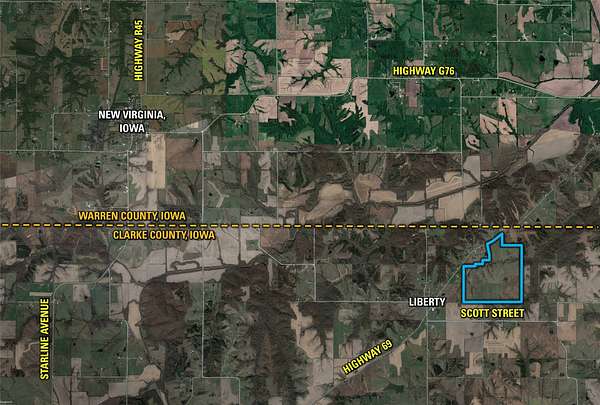 From New Virginia, IA: Head E out of town on HWY G76 for 7.3 miles. Turn right and go S on US HWY 69 for 3 miles. The property will be on the SE side of US HWY 69 off of the new blacktop. From Osceola, Iowa: Go E out of town on HWY 34 and travel 5.9 miles. Turn left onto the Liberty HWY/R59 and continue N for 7.9 miles. Take a slight right onto US HWY 69 and travel NE for 1.2 miles. The property will be on the SE side of US HWY 69 off of the new blacktop.