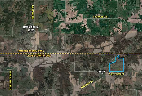 The property is located on US Highway 69, just east of New Virginia, Iowa, and northeast of Osceola, Iowa on the Clarke/Warren County line. The property can be accessed via two entrances on the new highway blacktop along the northeast and northwest corners of the property. Excellent creek crossings and interior gravel/asphalt roads provide great access to all of the individual paddocks to easily rotate and work livestock.
