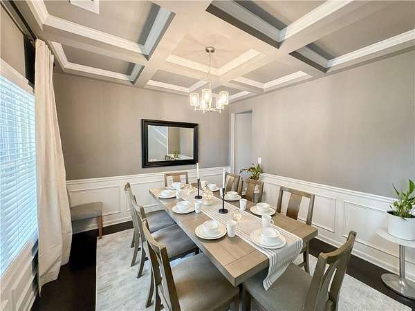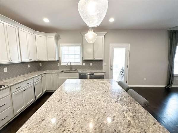 The main level features a bright two-story foyer, a formal dining room with detailed trim work, and a generously sized great room centered around a wood-burning fireplace. The kitchen is equipped with built-in stainless steel appliances, a stainless vent hood, granite countertops, timeless cabinetry, and a herringbone tile backsplash. A large island opens to the breakfast area, creating a functional layout for everyday living and entertaining. A walk-in pantry provides additional storage.