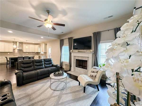 Additional features include hardwood flooring throughout the main living areas, a covered front and rear porch, and the signature Gameday Patio with fireplace, offering an inviting outdoor space. The seller has cleared a section of the wooded area near the home, extending toward the water's edge, enhancing both usability and views of the property.