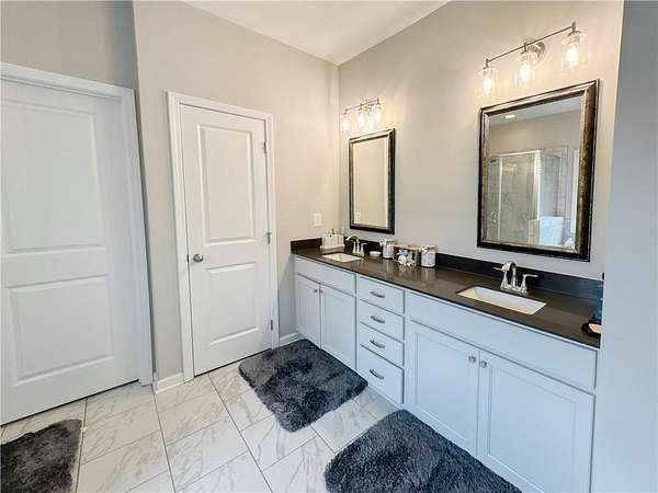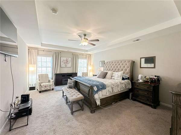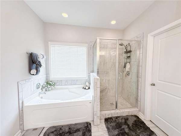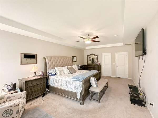 The primary bedroom is located on the main level and features tray ceilings and abundant natural light. The en-suite bathroom includes a garden tub, tiled shower, and a spacious walk-in closet. A signature drop zone is located at the owner's entry, and a half bath on the main level offers added convenience for guests.