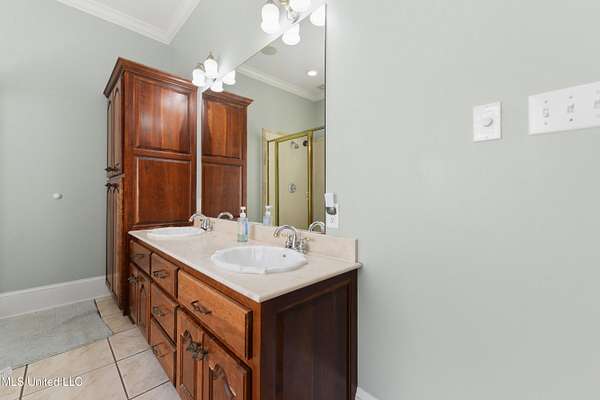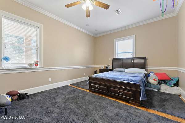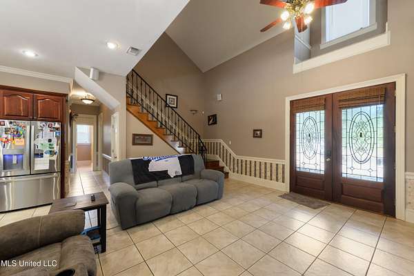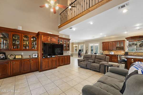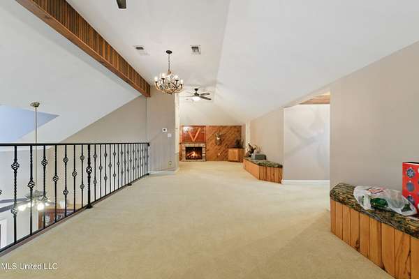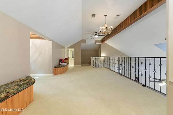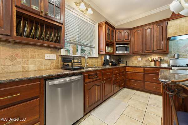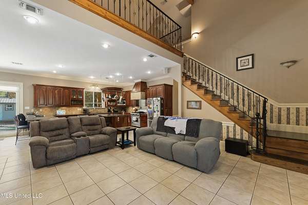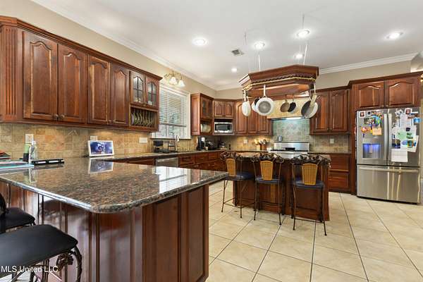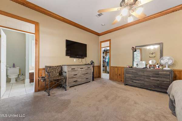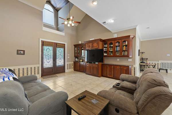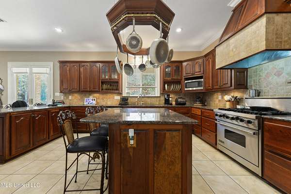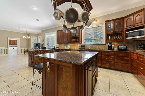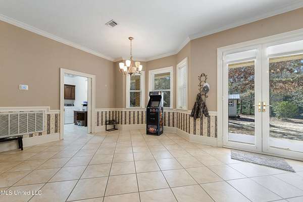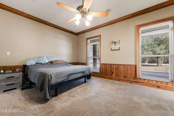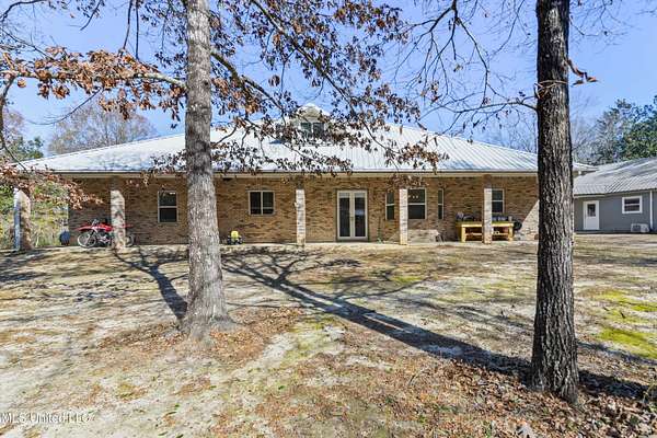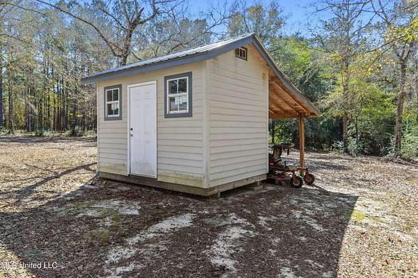 This stunning 3-bedroom, 2.5-bath custom-built home offers peaceful country living with exceptional craftsmanship throughout. Nestled on approximately 2.74 acres, the property is surrounded by mature trees and thoughtfully designed landscaping, complete with French drains and multiple inviting spaces to enjoy views of local wildlife from both the front and back porches. Pride of ownership is evident from the moment you arrive. Exterior features include a durable metal roof and 2x6 exterior walls, while the interior showcases locally harvested Mississippi cherry wood cabinets, Australian cypress flooring, large crown molding, and 10-foot ceilings throughout, creating a warm and welcoming atmosphere. The spacious kitchen is both elegant and functional, featuring granite countertops, a travertine tile backsplash, and a gas stove, all seamlessly flowing into the open-concept living and dining areas-perfect for entertaining or everyday living. The split floor plan provides privacy and ample space for family and guests. The primary suite is a true retreat, highlighted by custom woodwork, a jacuzzi tub, walk-in shower, double vanity, and generous walk-in closets. Upstairs, custom stairs and a beautiful railing lead to a versatile bonus room overlooking the living area, complete with a wet bar, refrigerator, and wine rack-ideal for a home theater, game room, or entertaining space. Additional features include new A/C units, an insulated detached garage with its own window unit and overhead storage, and a separate shed for lawn and yard equipment. This one-of-a-kind property combines comfort, quality, and serenity-everything you need to truly enjoy home.
