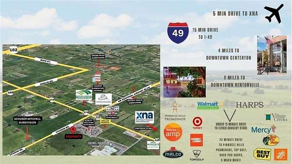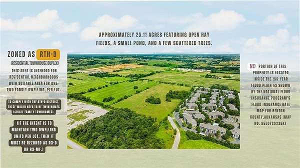 This 20-acre tract on Vaughn Road is positioned in Centerton's fastest-growing corridor! Prime frontage with immediate access to SW Regional Airport Blvd, which carries over 11,000 vehicles daily. Just 5 minutes to XNA and 15 to I-49. Zoned R-2, ideal for duplex or two-family residential development that serves as a transition between single-family and higher-density housing in one of the most in-demand markets in Northwest Arkansas. Water line at the street and sewer approximately 2,100 feet west. Primarily open land with minimal trees allows efficient site planning. Surrounded by new residential communities, retail growth, and major infrastructure investment. This location offers the visibility, access, and momentum developers need to move quickly and maximize returns.