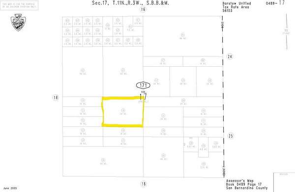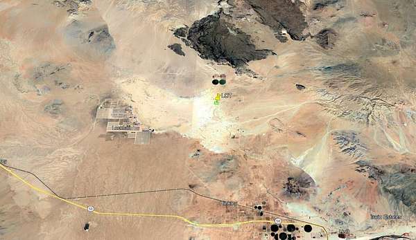 Hinkley Rd-north/ Orchard Rd-west 1.5 miles, then go south half a mile to the northeast corner of the lot at GPS Lat 35.0463 Lon:-117.21531