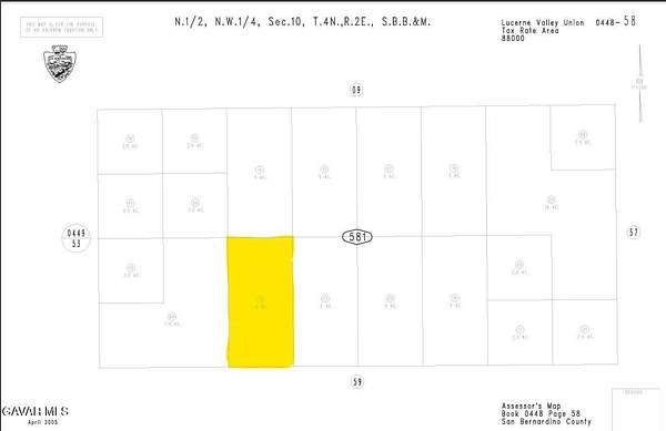 Old Woman Springs Rd (Hwy 247)/ Santa Fe Rd-north1 mile/ East End Rd-east 1.25 miles /Road H-north 9/10ths of a mile, then take the road heading northwest to the lot. Road crosses the lot at GPS Lat: 34.45458 Lon: -116.7675