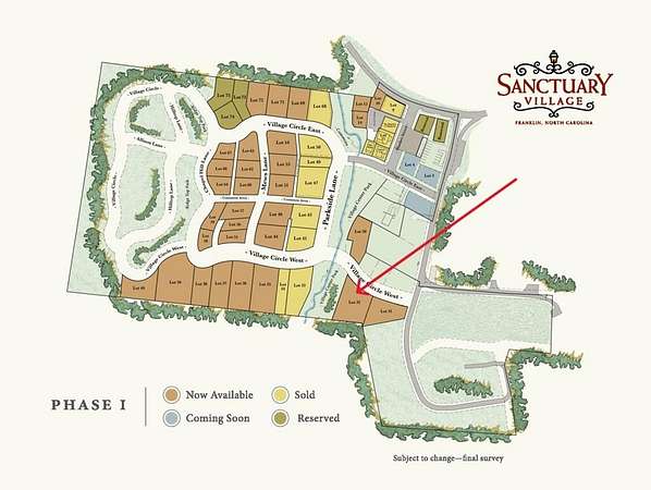 Discover Homesite 32 at Sanctuary Village, an oversized, wooded homesite bordered by a gentle creek, and across from a beautiful, newly built home. Just a few blocks from downtown Franklin, this homesite offers the ideal balance of privacy, neighborhood charm, and easy access to local shops, restaurants, events, and the Little Tennessee River Greenway. Homesite 32 is conveniently located near Sanctuary Village's parks, trails, and shared community spaces, making it easy to enjoy a connected lifestyle. Underground utilities-including water, sewer, natural gas, and high-speed internet-are already in place for efficient, modern living. Sanctuary Village is a thoughtfully planned community designed to foster connection, accessibility, and a healthy lifestyle in the heart of quaint Franklin, NC. We invite you to explore the neighborhood, relax at the welcoming park entrance, and envision your future home taking shape. Interested in experiencing the community firsthand? Stay in our on-site cottage-fully refundable with homesite purchase. Contact us to schedule a visit and learn about developer financing. Photos show existing homes and an example of a home that could be built here.