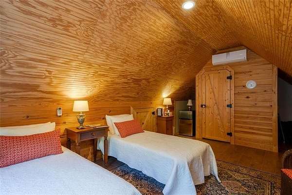 The detached garage and workshop include finished living space above that is perfect for guests, hobbies, or rental use. The guest suite features hardwood floors, shiplap walls, an antique French roll-out window, a private bathroom with granite vanity and vessel sink, and a mini split heating and cooling system for comfort year-round.